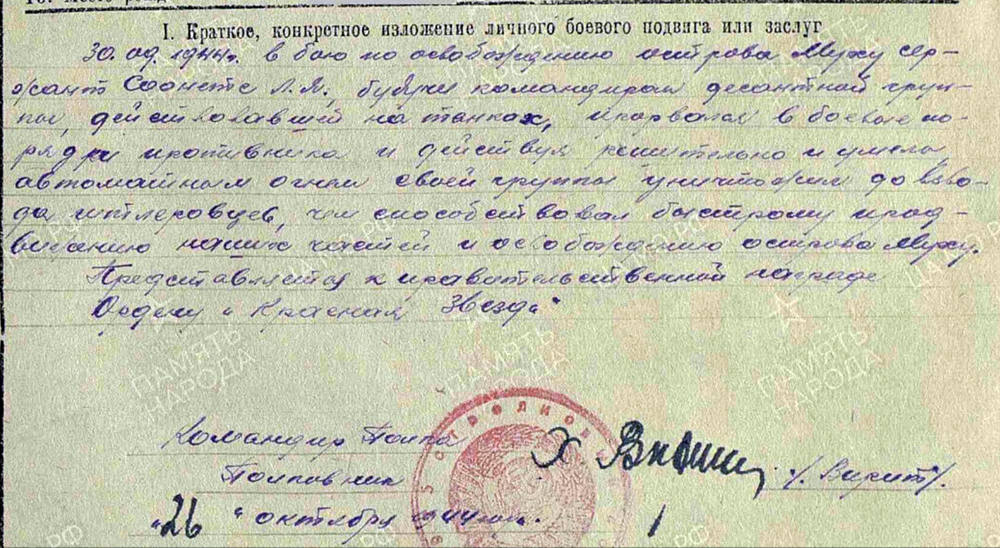 „Diviisi Saaremaa lahingutegevuse alguses töötas ta sidemeeskonna telefonistina. 5. oktoobri hommikul Linnuse külas, olles vaenlase tule all, paigaldas ta miinipilduja tule all kaabli. Vaatamata sellele, et ta korduvalt sattus vaenlase tule alla, teostas ta kaabli paigaldust üle Väikese väina tammi. Suurtüki- ja miinipilduja tule ajal ning õhurünnaku ajal hoidis ta ühendust juhtimispunktiga, olles liini vaatlejaks. Oma ohvrimeelsuse ja kangelasliku tööga tagas ühenduse diviisi staabi ja edasiliikuvate väeosade vahel.“