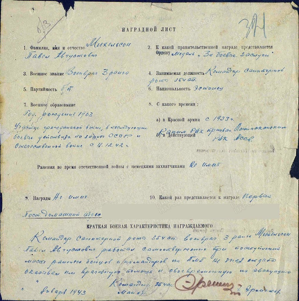 Ernst Hanson jah 925. laskurpolk, 249. laskurdiviis. Sõja ajal ta autasusid ei saanudki, ainus orden on see mis talle 1985. aastal anti.