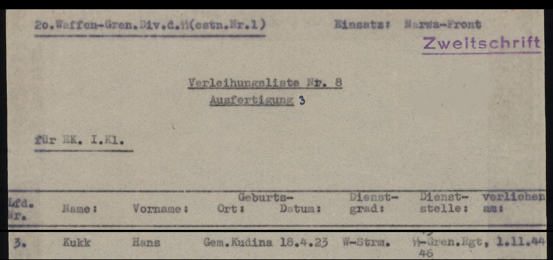 Tema EK2 annetamise dokumenti ei ole õnnestunud arhiivist leida aga EK1 oma on täitsa olemas kuigi eksitud on auastmega, Obersturmführer'i asemel on ta kirja läinud kui Oberscharführer.
