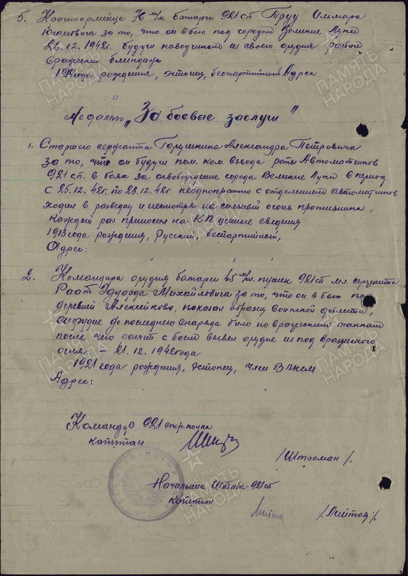 Selle Vapruse medali (135169) sain juba mõned aastad tagasi aga nüüd sai arhiivist ka taustainfo tellitud. Autasu on annetatud juba 1942. aasta 29. detsembril Velikije Luki lahingute eest 249. laskurdiviisi 921. laskurpolgu 3. pataljoni 7. roodu punaarmeelasele Harald Saidla'le. Autasustamislehel on kirjas, et 1942. aasta 27. detsembril hävitas ta käsigranaadiga vaenlase kuulipildujapesa, mille järel õnnestus pataljonil edasi liikuda. Pamyat Naroda ja Memento andmebaasides on kirjas, et Saidla on alates 1943. aasta 8. jaanuarist Velikije Luki juures teadmata kaduma jäänud. Samas on tema Venemaa arhiivist tellitud dokumendile märgitud, et astus 1943. aastal parteisse ja sõjaväes oli 1941. aasta juulist kuni 1945. aasta septembrini. Sai siis näiteks haavata ja lohistati mõne teise üksuse sanitaride poolt minema, mille tõttu loeti oma üksuses kadunuks. Võimalusi on ilmselt mitmeid, sest Luki all oli kõik nii segane.