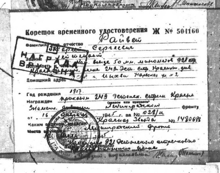 Kapten Sergei Raivet, 249. Eesti Laskurdiviisi, 921. laskurpolgu, 5. laskurroodu 50mm miinipildujate rühmakomandör. Punatähe ordeni nr. 1480688 kavaler. Lisaks on teda autasustatud veel ühe Punatähe ordeniga, mis kannab numbrit 3536526 ja ilma numbrita Lahinguteenete medaliga. Viimased kaks autasu on ilmselt antud Punaarmees väljateenitud aastate eest.