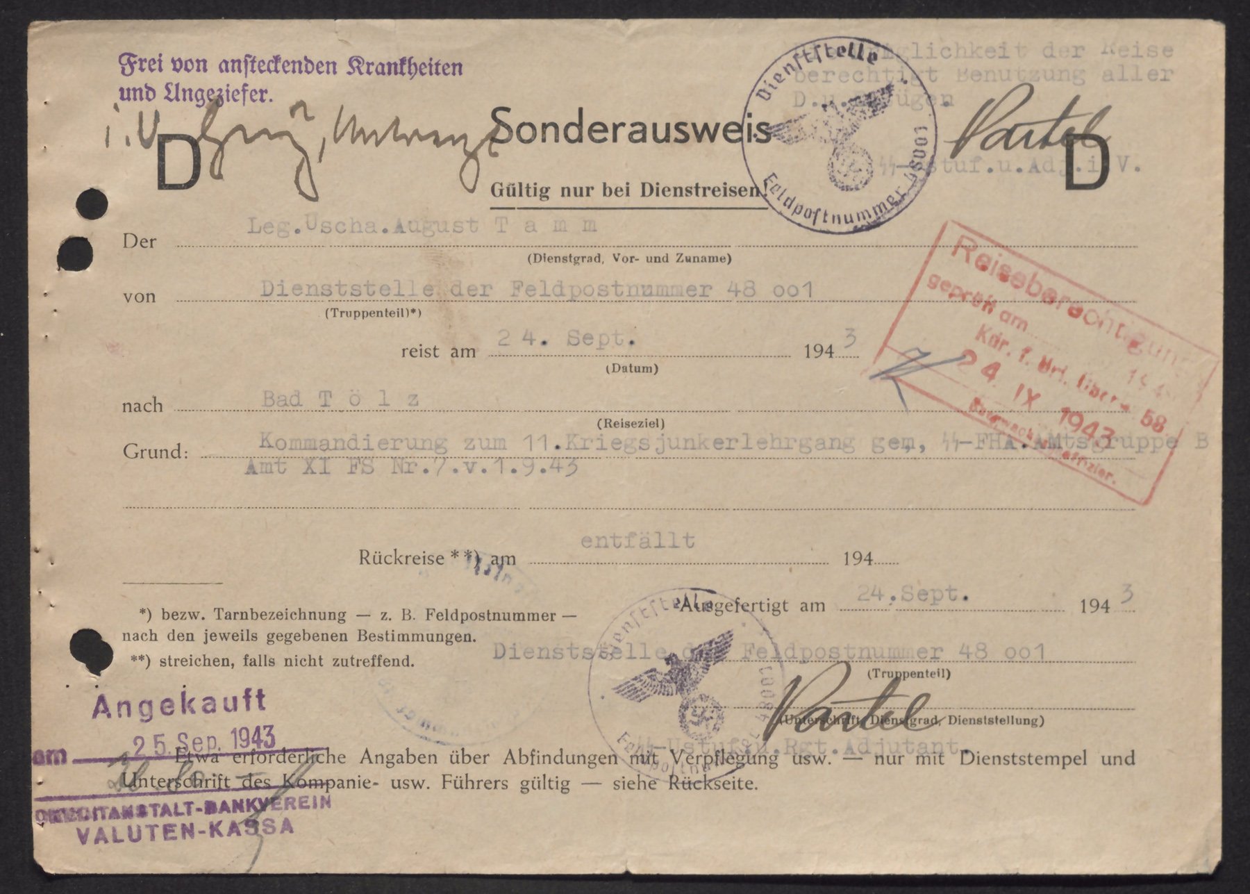 Veel keegi August Tamm, auastmelt Unterscharführer. On komandeeritud Junkerschule Tölz'i ohvitseride kursustele ja 1943. aasta 24. septembril teele saadetud, dokumentile on alla kirjutanud Untersturmführer Väino Pärtel. Kahjuks sellistele dokumentidele ei märgitud peale reisiselli sünnidaatumit ega muid täpsustavaid andmeid.