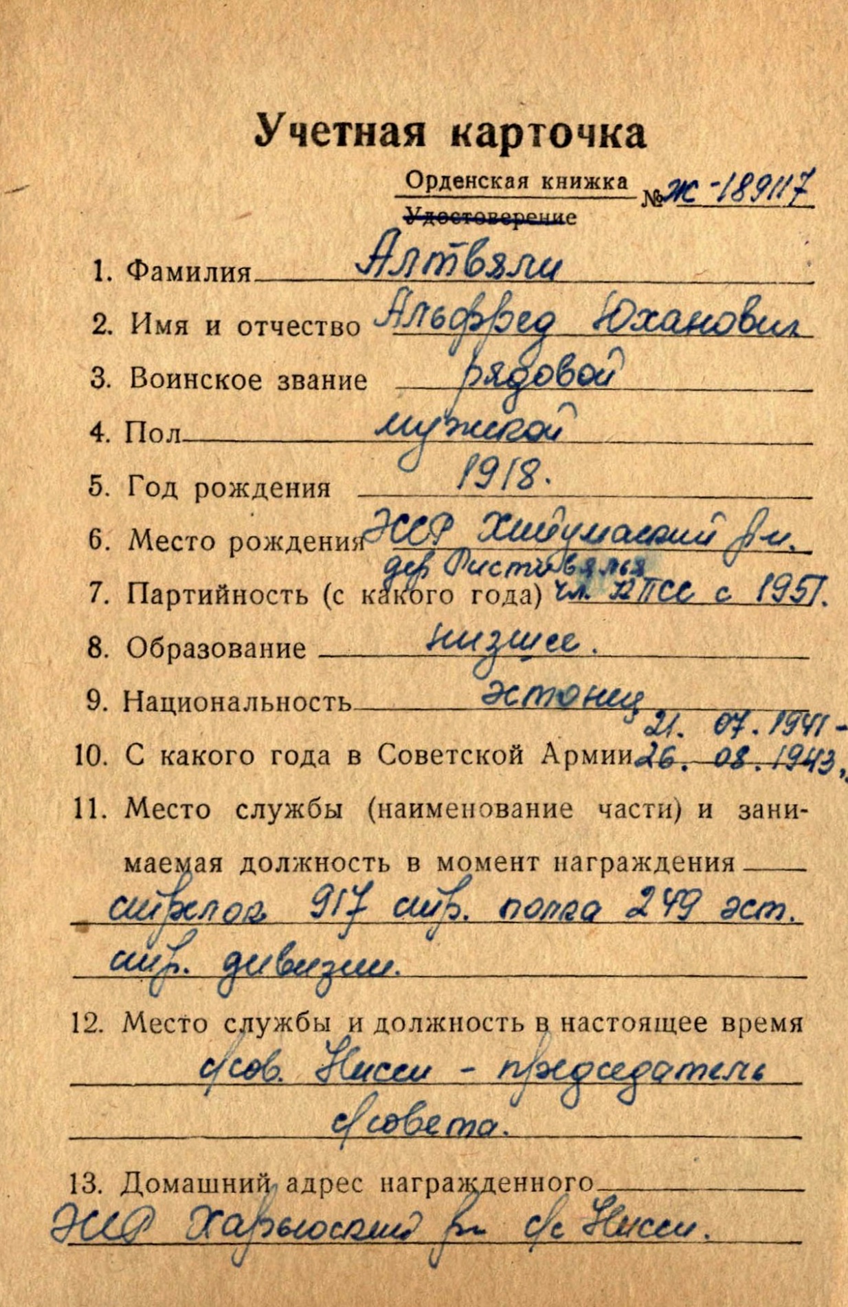 Isamaasõja orden №940363 Alfred Altvälile,15.02.1968, haavatasaamise eest.
