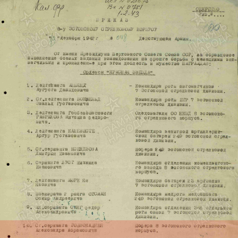 ’’Alates korpusesse saabumisest töötab minu autojuhina. Liikudes üksuste vahel, väljasõitudel vaatluspunktidesse ja tihti ka sõitudel lahinguolukorras üksi või koos adjutantidega käitub alati külmavereliselt. Lahingolukorras pole mitte kordagi sattunud segadusse, selle tõttu pole pidanud auto seisma. Orienteerub olukordades hästi ja lahingolukorras pole mitte kunagi kaotanud pead. Erilist vaprust näitas üles Kuramaal, kus vaatamata sellele, et vaatluspunkt asus eesliini lähedal ja ilmastikuolud olid rasked, töötas alati ennastohverdavalt’’