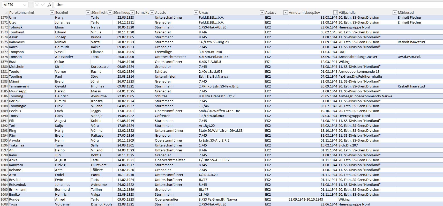 Ma ei ole siia teemasse viimasel ajal uusi nimesid lisanud, sest on plaan teha veebipõhine otsingumootori ja filtritega andmebaas. Hetkel olen Bundesarhiivi poolt avalikuks tehtud autasustamisnimekirjadest välja sõelunud ca. 2000 eestlast ja nüüd otsin siit teemast neid nimesid, keda arhiivimaterjalides ei olnud ning lisan need ka Excelisse.