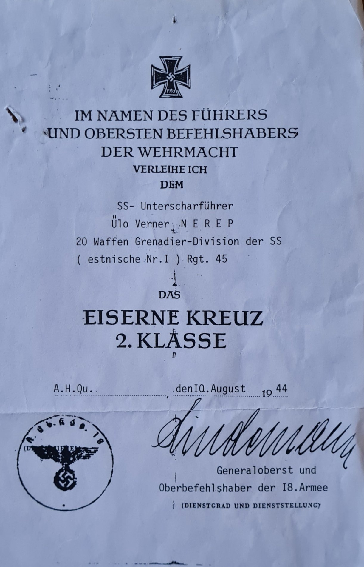 Unterscharführer Ülo Nerep'i EK2 tunnistuse koopia.
