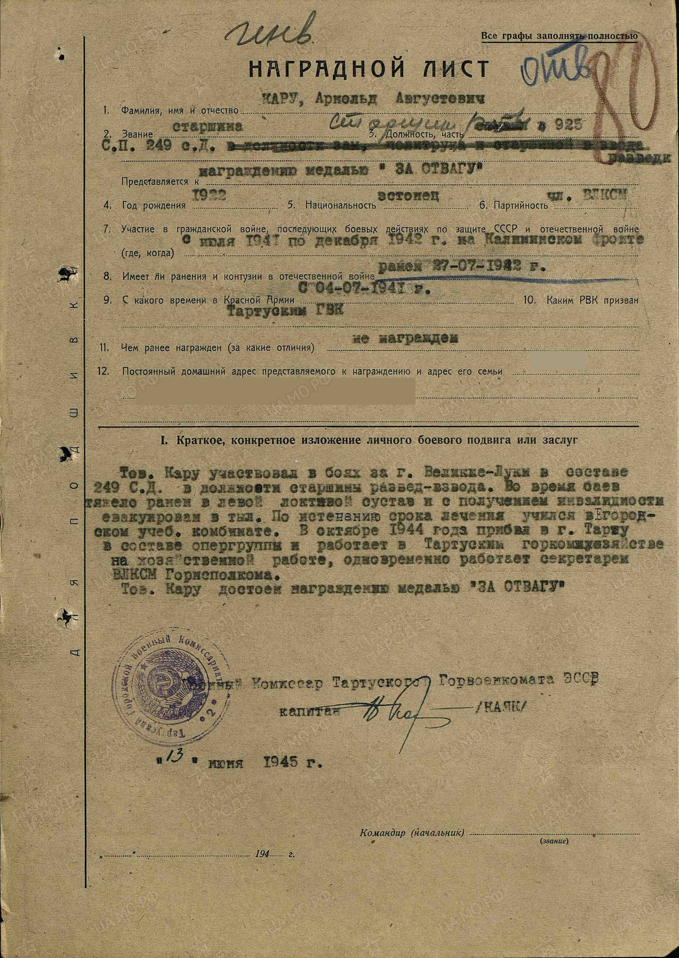Korpusepoiss Arnold Karu, 249. LD, 925. LP.