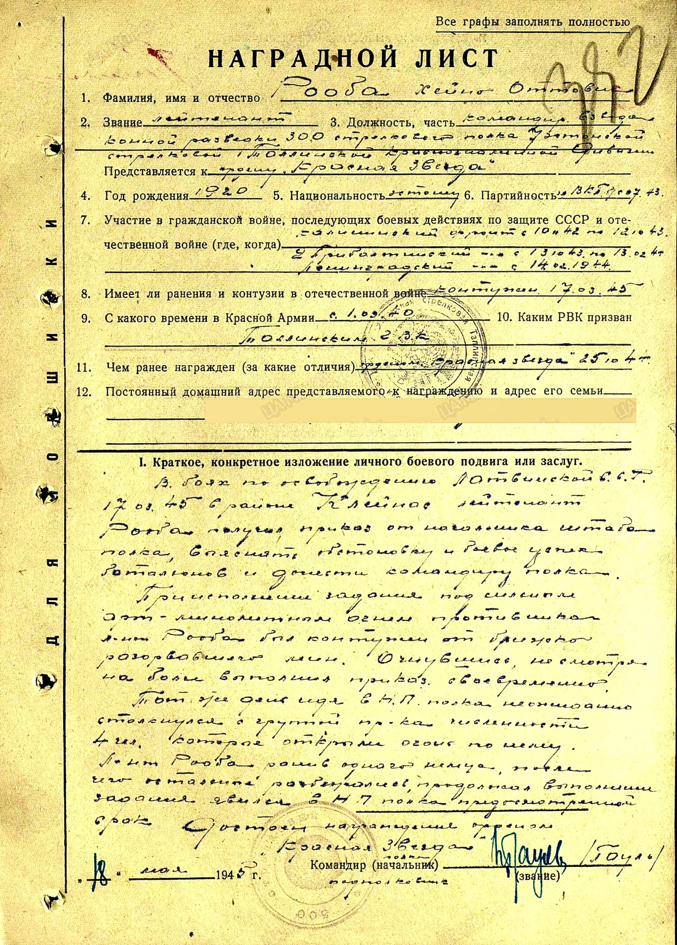 300. laskurpolgu 7. laskurdiviisi ratsaluurerühma komandör nooremleitnat Rooba juhtis isiklikult luuretegevust Kuressaare linna rajoonis. Tänu tema julgele ja otsustavale ratsaluure salga juhtimisele 07.10.1944, tegi kindlaks vaenlase sõjalise ja arvulise koosseisu ning nende edasised kavatsused. Need andmed olid vaenlase grupeeringu purustamisel ja hävitamisel Kuressaare rajoonis otsustava tähtsusega. Tegevuse käigus võttis ratsasalk vangi 12 vaenlase sõdurit.