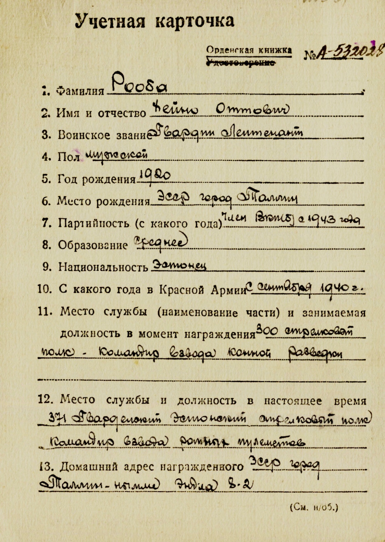 Ja siin ongi teine Punane Tähttossom kirjutas: ↑R Sept 06, 2019 3:35 pm 300. laskurpolgu 7. laskurdiviisi ratsaluurerühma komandör nooremleitnant Heino Rooba Punatähe orden nr. 1147070.
