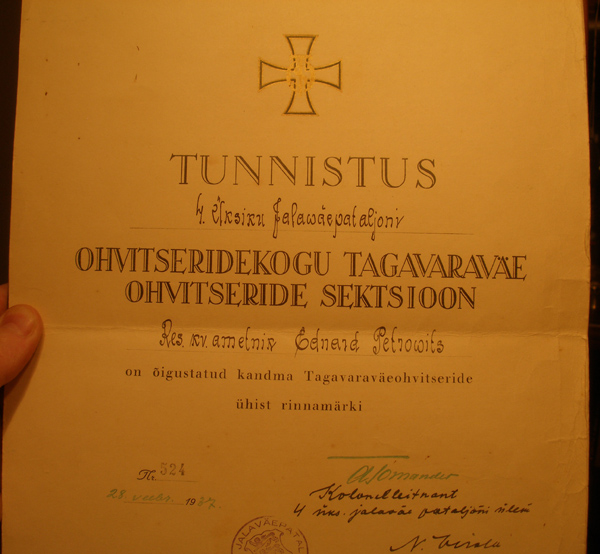 Tunnistus: 4.Üksiku Jalawäepataljoni OHVITSERIDEKOGU TAGAVARAVÄE OHVITSERIDE SEKTSIOONI poolt reserv kv.ametnik Eduard PETROWITS-le, selles, et ta on õigustatud kandma Tagavaraväeohvitseride ühist rinnamärki.