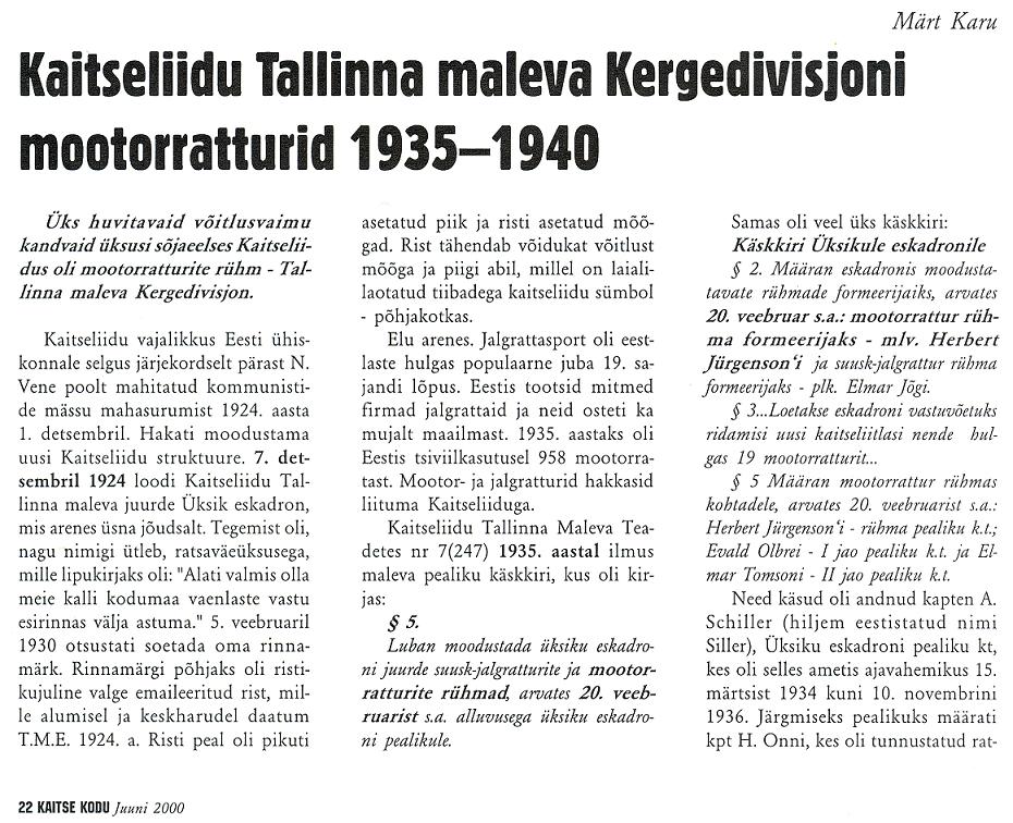 Eesti mootorrattaajaloo uurija ja tsiklikoguja Märt Karu on kirjutanud artikli "Kaitseliidu Tallinna maleva Kergedivisjoni mootorratturid 1935-1940" (ajakiri Kaitse Kodu. 2000.a. III. Lk 22-23). Kui kellegil see number olemas, siis võiks siia üles panna.