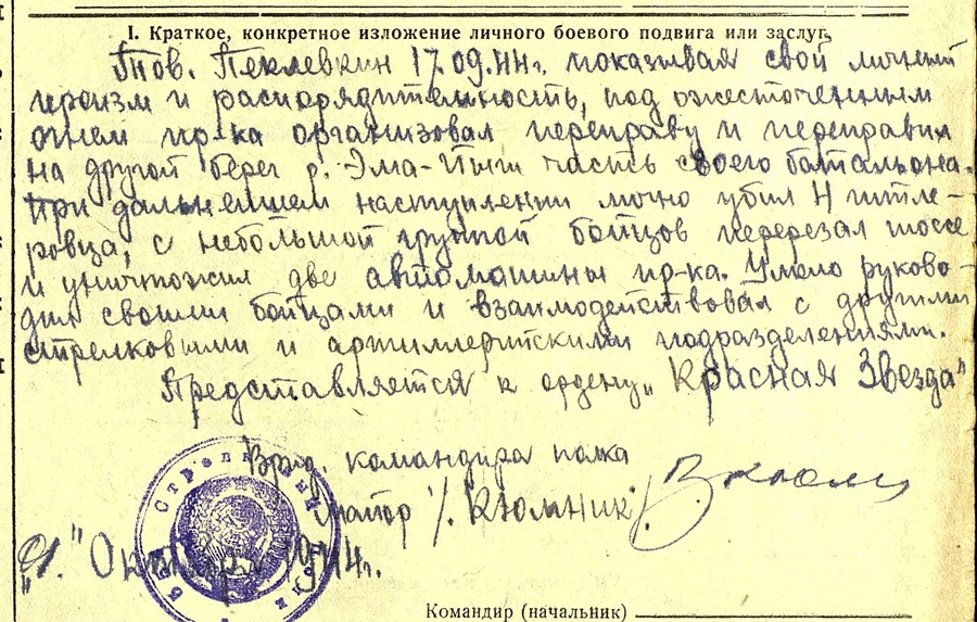 Eesti Laskurkorpuse 373. Laskurpolgu kuulipildujaroodu komandöri Peeter Peklevkin. Sai Punatähe ordeni ja seda Emajõe forsseerimisel, kus väikese grupi oma pataljoni võitlejatega ületas Emajõe, tappis isiklikult 4 sakslast, lõikasid ära tee ja hävitasid 2 vaenlase veokit.