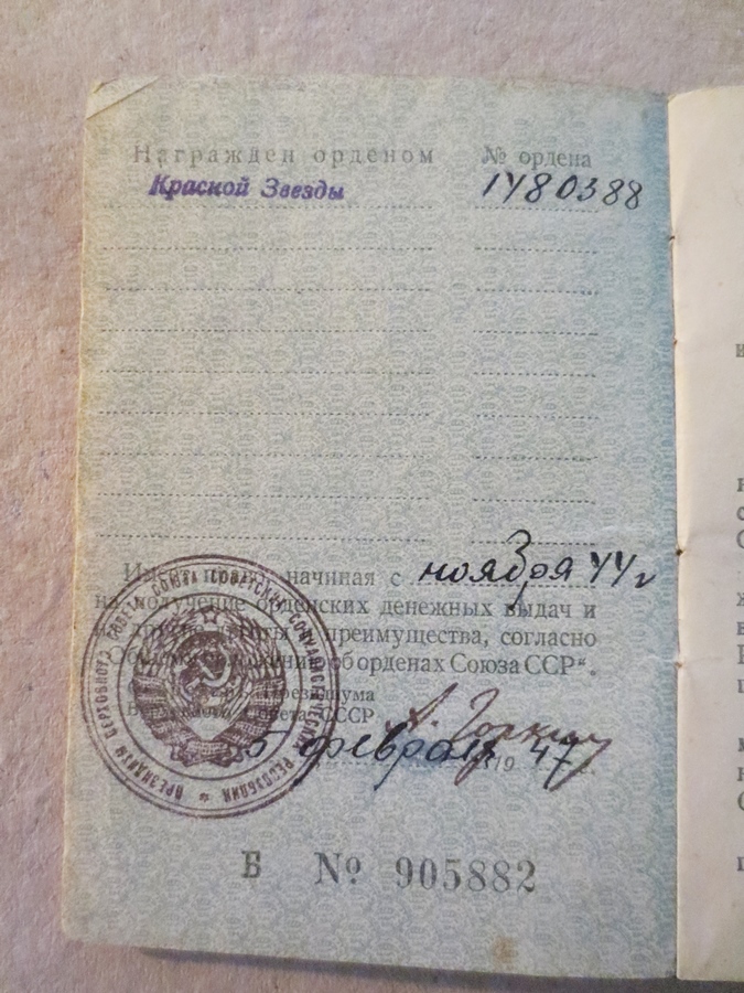Laskurkorpuse 368. Kaardiväe Laskurpolgu reamehe Artur Tammjala Punatähe orden.