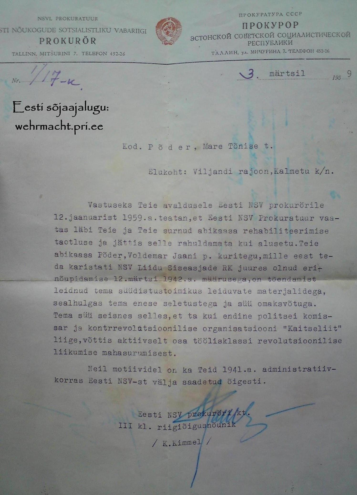 Vastus Voldemari abikaasa rehabiliteerimise taotlusele kurikuulsalt ENSV prokurörilt Karl Kimmellilt, 1959.a.: