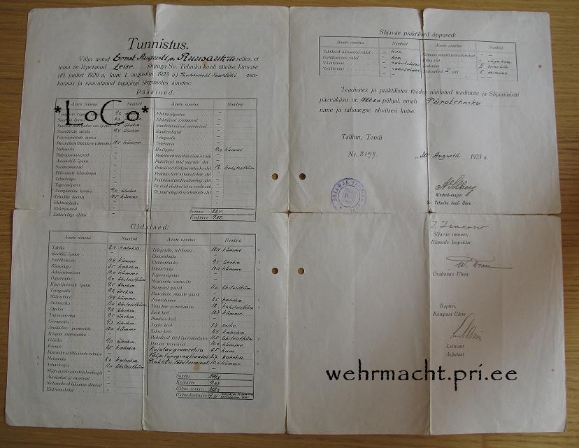 Sõjaväe Tehnikakooli I lennu (1920-23) lõpetanud Ernst Ruusaugu tunnistus. Kooli vastu võetud kadetid määrati osakondadesse nende omal vabal valikul. Ruusauk oli pürotehnika osakonnas, kus oli kokku 6 meest. Lennus oli kokku ainult 75 meest, niiet üsna haruldane tunnistus!
