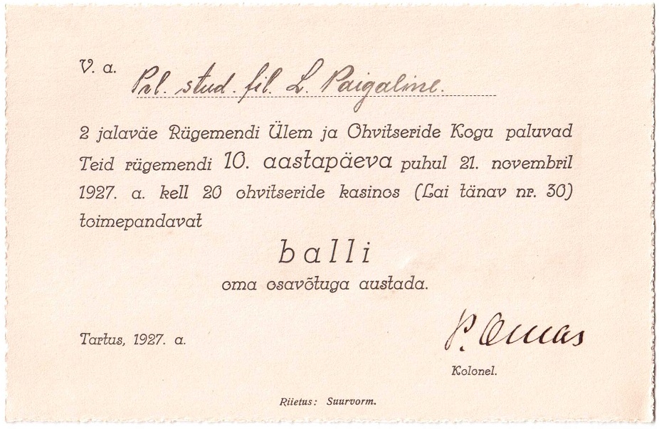 See kutse on muuseas sellele preilinale:Ülo kirjutas:Kas alla on kirjutanud kolonel Peeter Oinas?