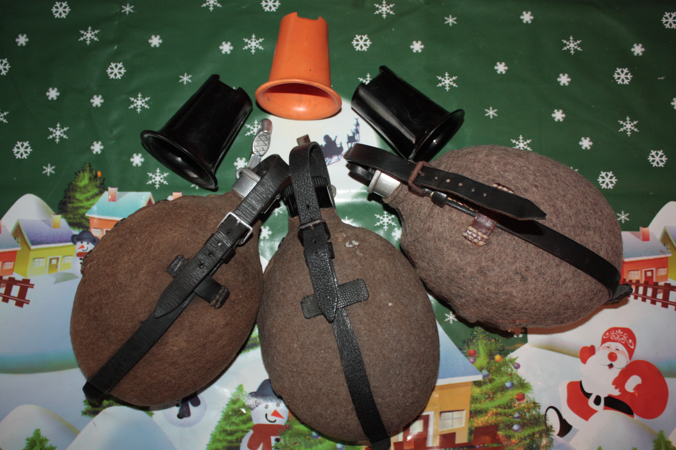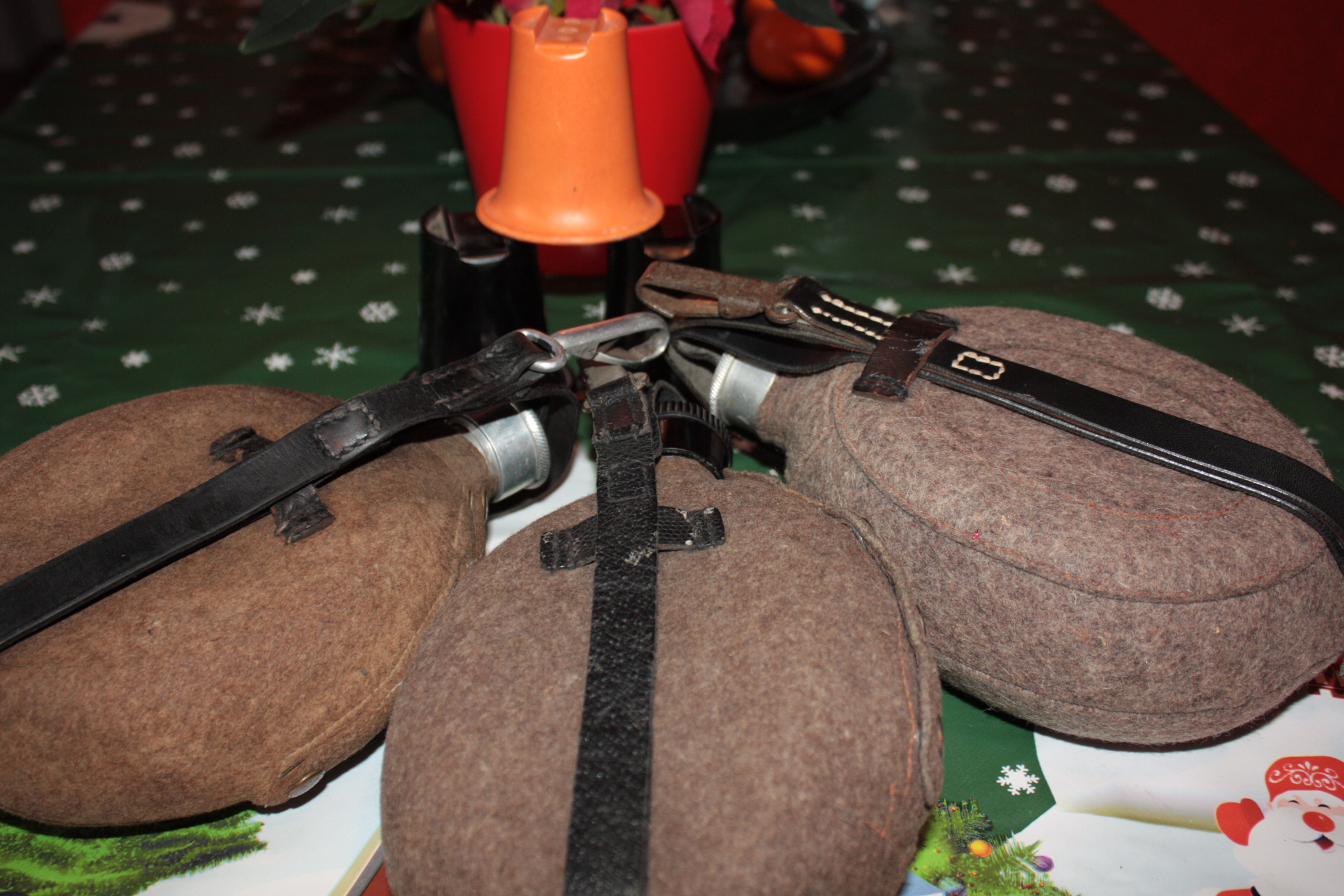 1) pudel OLHM37, kork ja rihmad CFL37, vildi markeeringust raske aru saada, aasta igal juhul 38. Tundub, et juba sõja ajal erinevatest detailidest kokku pandud, sest pudelipõhjal ja vildil on samad vigastused. Korgile kraabitud nimi M. Burckhardi