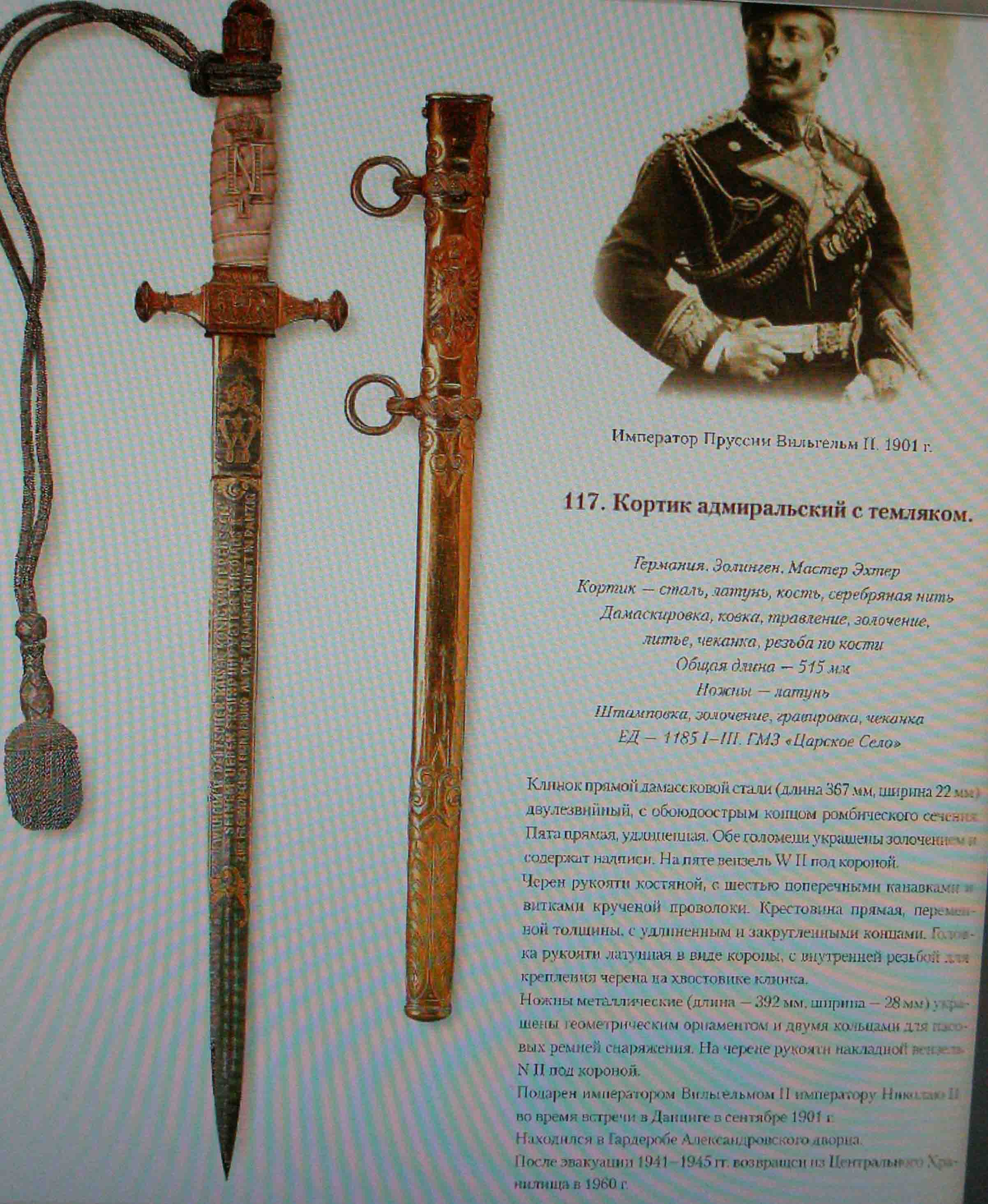 Как и обещал, позвонил сейчас Ввведенскому - руководителю отдела оружия в Царском селе, моему хорошему знакомому и вообще прекрасному человеку. Он мне все рассказал, его уже задолбали звонками. История такова: в первой половине 90-х, когда была полная ж.... и музеи просто голодали, тогдашнее руководство приняло решение изготовить некоторое кол-во копий самых ценных экспонатов, штук по 10-15 на продажу, чтобы подкормить коллектив. Там и награды, и украшения, и оружие. Делали их реставраторы с изменением размеров и некоторых деталей для четкой атрибуции в случае чего. К каждому предмету полагался сертификат, на оружие их выписал сам Введенский, все было сделано честно, хотя сам Георгий Эдишерович возражал против копий. Вот собственно и вся история. Жаль коллекционера, но сам виноват, покупая такие предметы надо их тщательно атрибутировать и обязательно получить провенанс, без которого такой предмет пустышка.