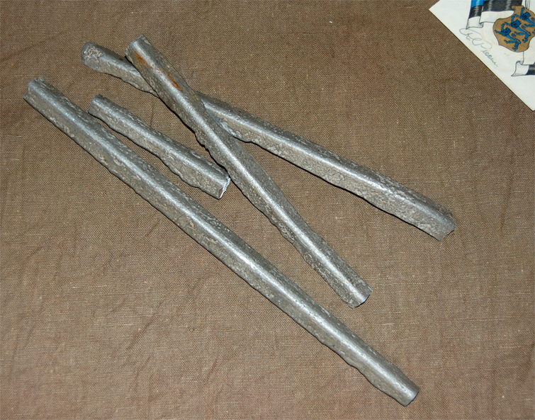 Niisiis, pildil on 4 tükki tina. Väga puhas ja rabe, painutamist väga ei kannata, murdub. Asjakohast nii palju, et sel pildil olevad tinajupid on pärit Eesti ühe vanima kiriku oreliviledest Urvastes, milledele sakslased metallikogumiskampaania käigus kirve sisse ajasid ja milliste hulgas kõvasti lageraiet tegid. Suurem osa saagist läks seejärel võiduka Punaarmee ridade harvendamiseks, aga muist vehkisid külamehed sisse, sulatasid panninurgas kokku ja siin see nüüd on. Seega siiski, sõjaajalooga seotud teema... mingil määral.