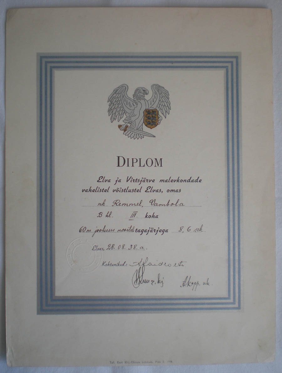 Valter Ferdinand Tohvelmanni 1.jalaväerügemendi spordidiplom.