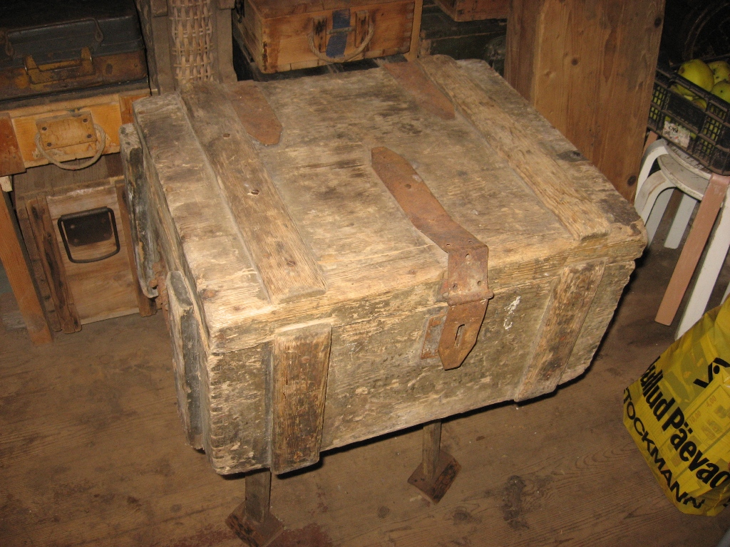Selline tore kast muretsetud. Sisse paistab olevat läinud 6 suure kaliibrilist hülssi. Tagumise otsa läbimõõt umkaudu 28cm. Hülsi pikkus 15cm. Vist I ms ajal olid mingisugused mörserid suht lühikeste hülssidega? Mina pakuksin kasti EW aegseks? Kas kellegile on tuttav sisse põletatud logo?