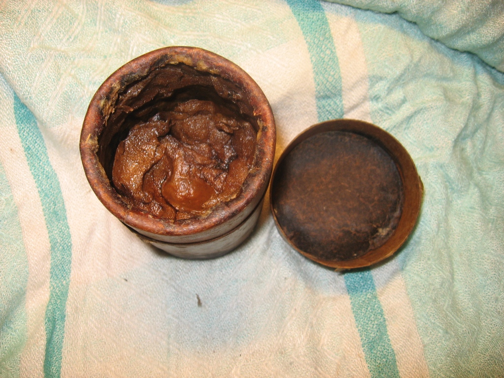 Hetkel sisaldab mingit salvi. Peale kirjutatud käsitsi: Reuma salv. Mis seal originaalis sees võis olla? Kas kasutati inimeste putitamiseks? Topsis tropiks tükk ajalehte VIRU SÕNA Laupäev 9. detsember 1944a. Artiklis Raietöö Sonda metskonnas , kommaritel mure et metsatöölisi vähevõitu. :twisted:
