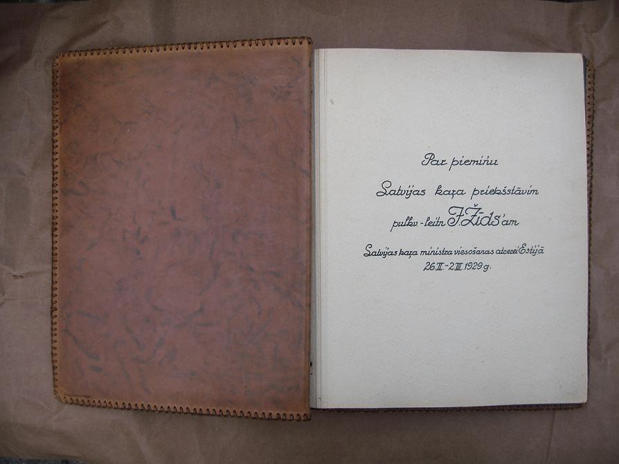 Фото №3. На титульном листе по латышски написанно: " На память военному представителю Латвии полковнику-лейтнанту Я.Жидсу в связи с визитом военного министра Латвии в Эстию 26.II. - 2.III. 1929 года." (Название Эстонии по правилам старой граматики было Estija (Эстия), т.е. страна Эстов. В 30-ые годы была принята новая граматика, по которой Эстония называлась Igaunija (Игауния), то есть так как на латышском языке Эстония называется и по сей день)
