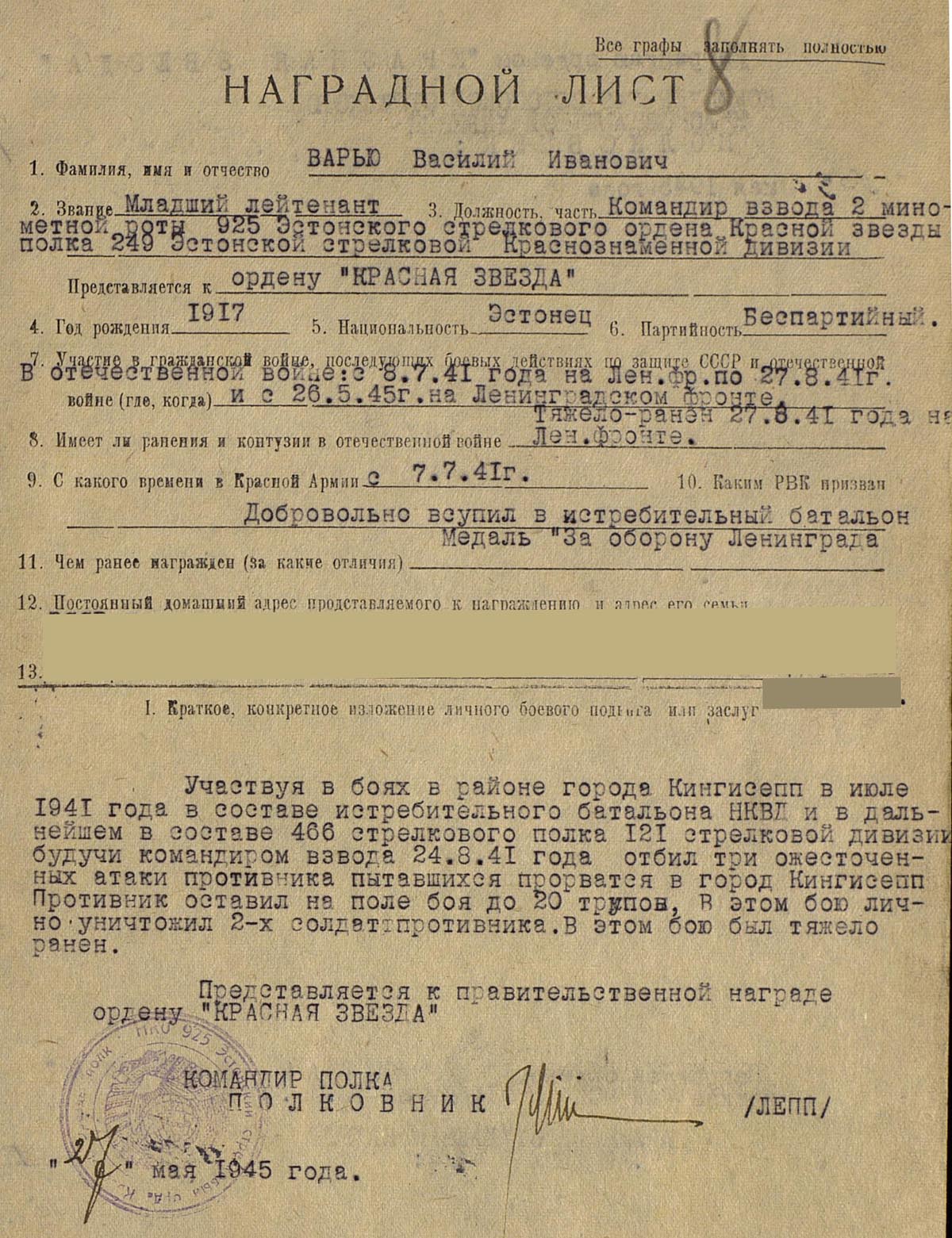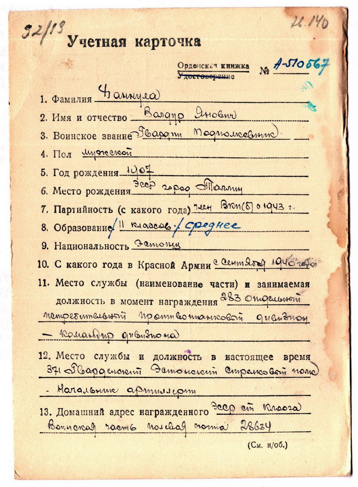 Punatäht on tuttavast Eesti Laskurkorpuse vahemikust, V.V. ordeni number 1 480 646. Dokument kahjuks puudu aga samas tuli Punatähega koos 1985. aasta Isamaasõja orden, millel raamat kaasas ja nimi sees.