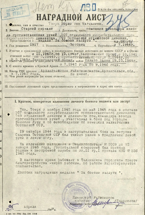 Boris Tork, 249. Laskurdiviis. Osales Velikije Luki lahingutes ja 1944. a lahingutes Eestimaa pinnal, sai Saaremaal raskelt haavata.