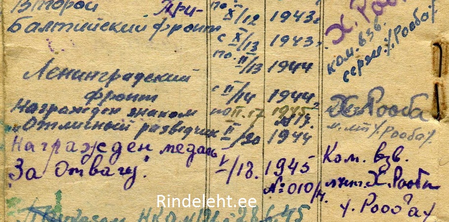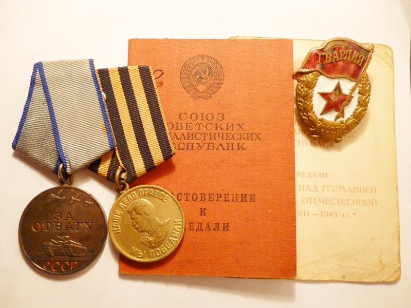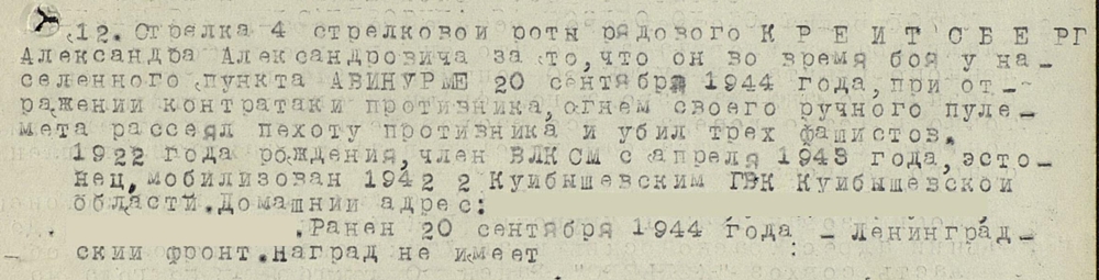 7. Laskurdiviisi 27. Laskurpolgu 4 roodu laskur, reamees Kreitsberg. Vapruse medali kavaler. Medal saadud 1944. a sügisel Avinurme lahingutes. Kaardiväemärk on samuti sama mehe oma.