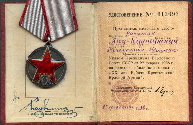 Kindralmajor Konstantin Karl Aru-Kaušinski (30. mai 1902 Tarva küla, Veltsa vald Läänemaa – 28. veebruar 1994 Tallinn) XX aastat RKKA medal.