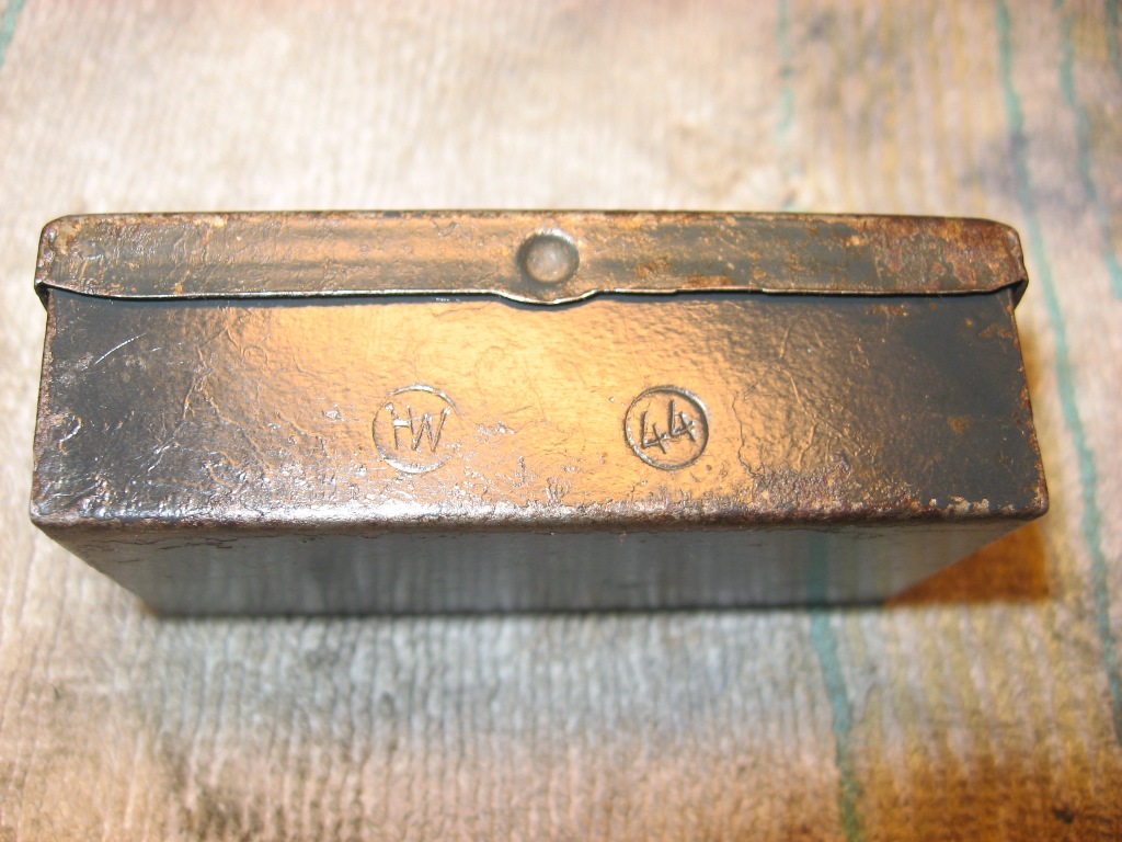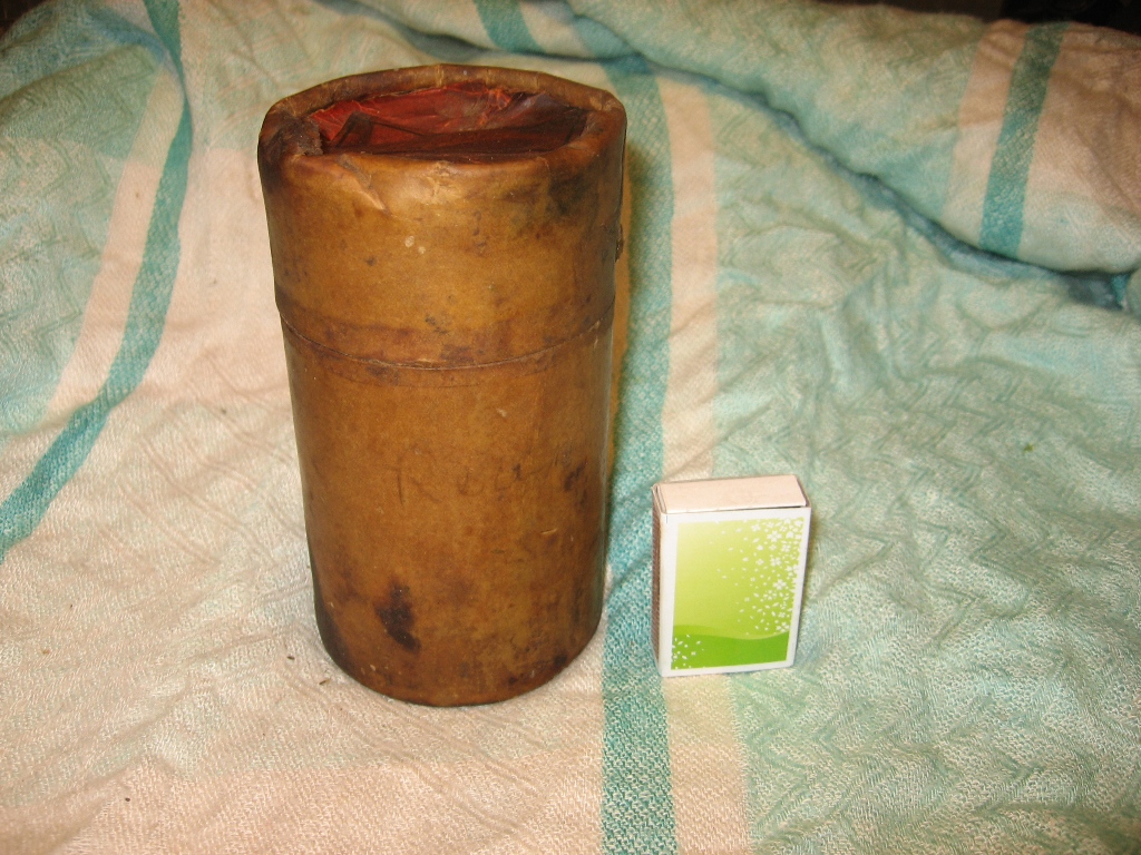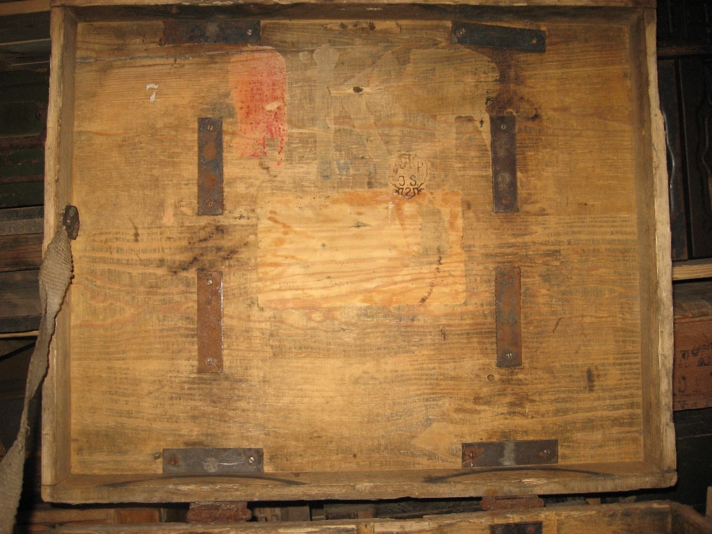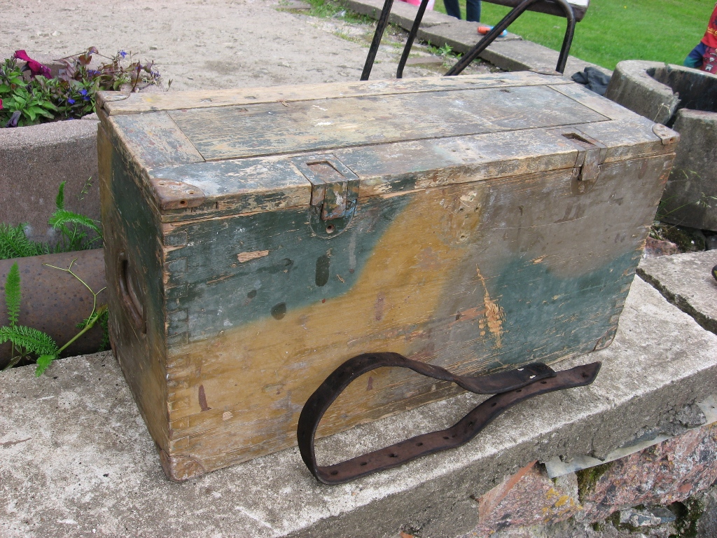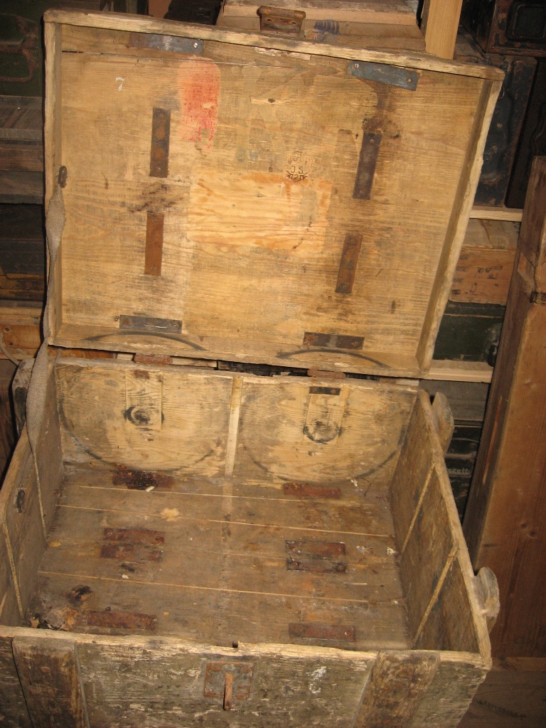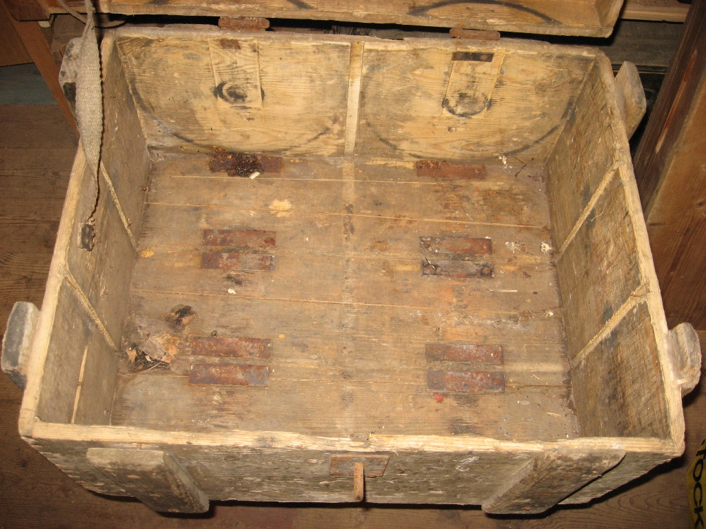 Selline tore kast muretsetud. Sisse paistab olevat läinud 6 suure kaliibrilist hülssi. Tagumise otsa läbimõõt umkaudu 28cm. Hülsi pikkus 15cm. Vist I ms ajal olid mingisugused mörserid suht lühikeste hülssidega? Mina pakuksin kasti EW aegseks? Kas kellegile on tuttav sisse põletatud logo?