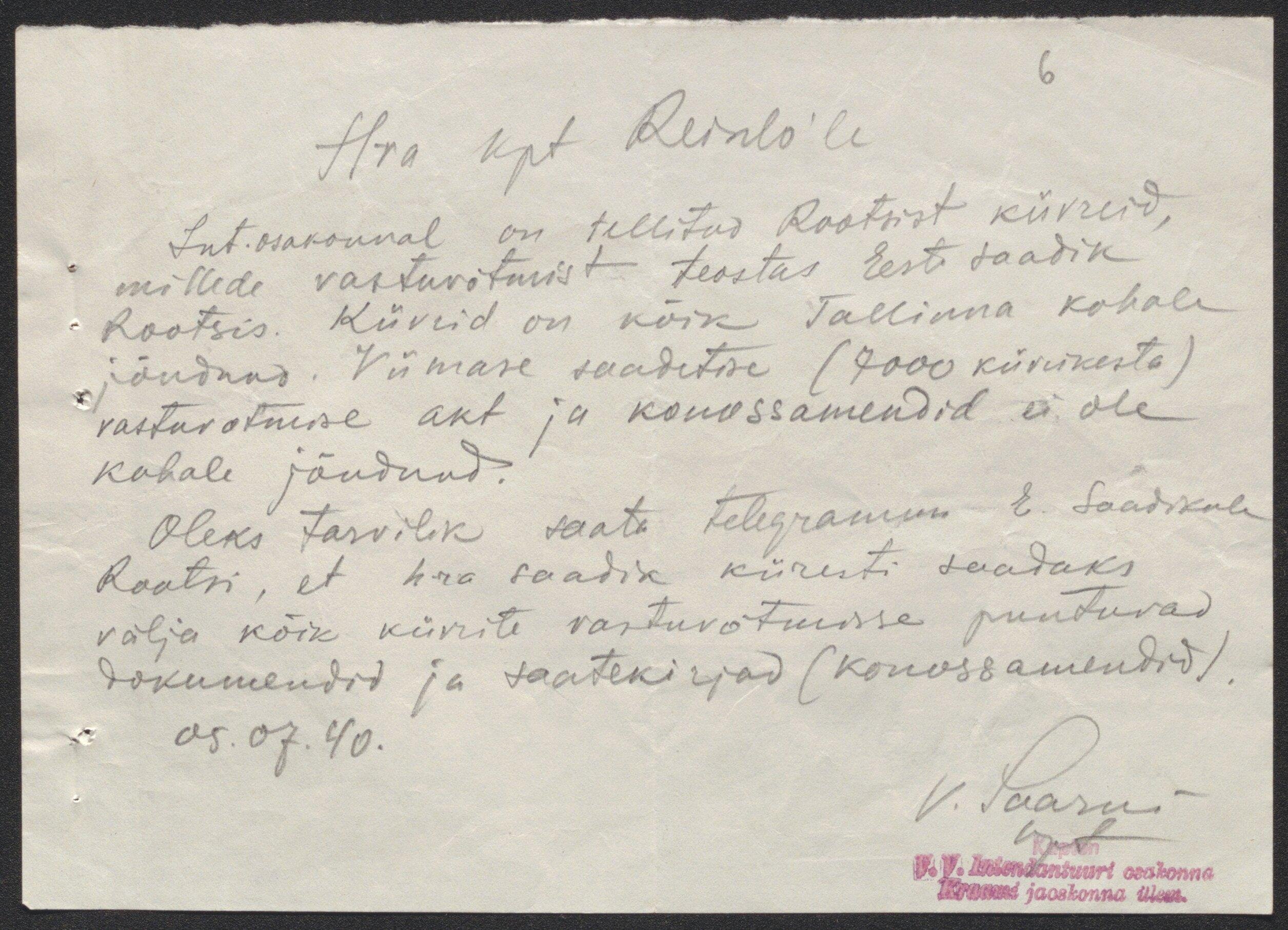 Rahvusarhiivis leiduva dokumendi järgi oli 1940. aasta 5. juuliks Eestisse jõudnud viimane saadetis (7000) Rootsist tellitud kiivrikestasid.