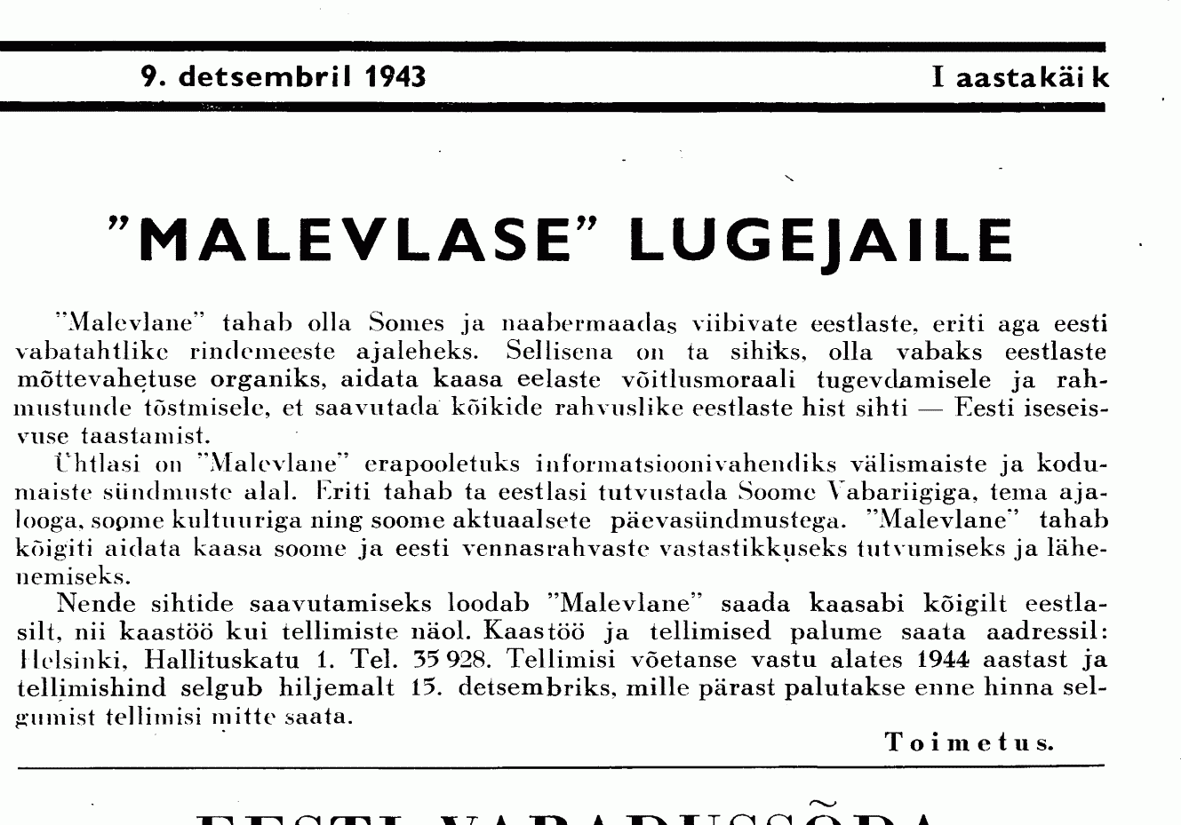 ""9.detsembril hakkas Soomes ilmuma eestikeelne ajaleht ”Malevlane”, mis on Soomes ja naabermaades viibivate eestlaste, eriti aga eesti vabatahtlike rindemeeste ajaleheks. Esimene number toob neljal leheküljel juhtkirja, pikema artikli Eesti vabadussõjast, ülevaate Moskva konverentsist ning informatsiooni kodu- ja välismaalt kui ka sõjapoliitilise ringvaate.