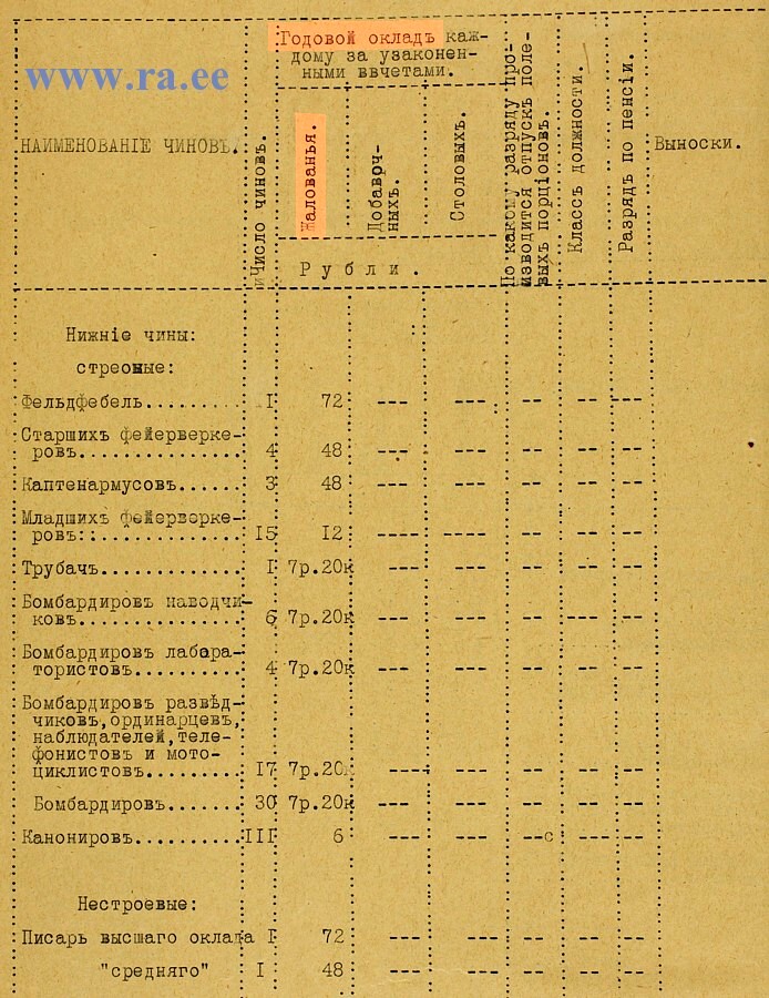 Üleajateenijad said siiski korraliku palga (oклад, пособие), mis maksti välja vastavalt kehtivale skaalale. Jefreitori 120'st rublast aastas kuni seal podpraporšikul juba 342 kuni 402 rublani aastas. Lisaks lisatasud (olenevalt auastmest ja teenistusajast) 280-400 rubla aastas. Ühekordne makstav toetus kahe aastase perioodi järel 150 rubla, allohvitseridel iga kümne aasta järgi aga 500 rubla. Lisaks maksti elamiskulud kinni ohvitseridele eluaseme üürimiseks ettenähtud summast 50% ulatuses. Lisaks maksti boonust abielumeetele, jefreitorile aastas 72 rubla kuni allohvitseride 180 rublani.