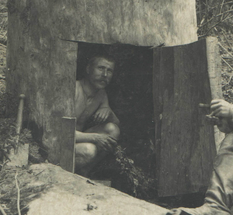 Üks kihvt eluolu pilt. Sõdurid on suure kännu sisse sauna ehitanud.