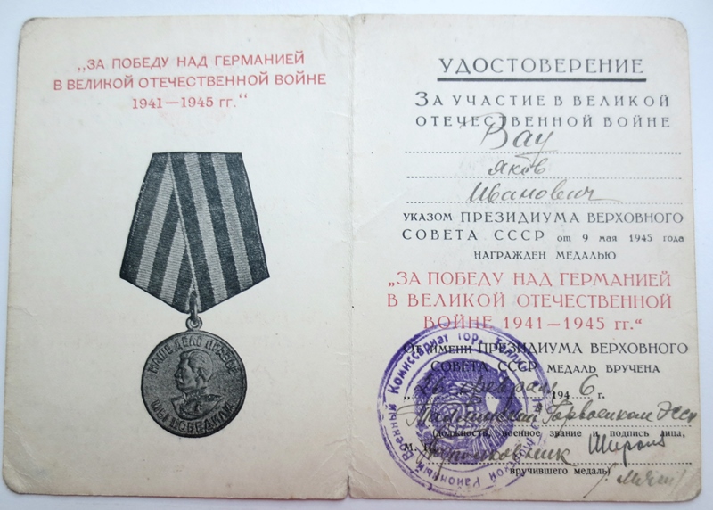Ja veel korpuse 46. Üksiku tankipolgu san.instruktor starshina Vau. Punatähe 1 190 943 kavaler. Vau on varem saanud ka Vapruse medali, kuid see on kahjuks kadunud, nagu ka ordeni raamat. Küll on aga alles Võit Saksamaa üle medali dokument ja ordeniraamatu juurde kuulunud sõidupiletid. Just täpselt nii on nad koos saadud.
