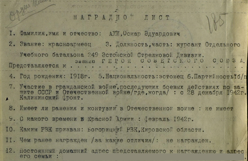 Oskar Ahi – Suure Isamaasõja ajal Lenini ordeniga autasustatud 249. laskurdiviisi üksiku õppepataljoni kursant. Esitati Luki all tehtud tegude eest Nõukogude Liidu kangelase kuldtähe saamiseks, aga sai Lenini ordeni ( mis on küll kahjuks kadunud... vist ). Üks vähestest eestlastest ( kui mitte ainuke ), kes ei olnud ohvitser ja keda sõja ajal konkreetse vapra teo või tegude eest Lenini ordeniga autasustati.