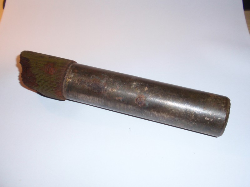 Tuli välja Saaremaalt Sõrve poolsaarelt prügihunnikust koos muu militaarse pudi-padiga.Seetõttu on alust arvata,et ka antud inventar on militaarjäänuk? Militaarsele päritolule viitab ka puitosa värv.Kaigas on puidust ja messingust / pronksist käepideme ümbrisega.Ainus markeering,mis olen leidnud on nr 8 puitosal aga äkki on see sinna juhuslikult tekkinud kriimustuse näol.Pikkus ca 15 cm ja kaal tänu messingule ca 1 kg või rohkemgi.Jämmust käepidemel 3,5 cm ja ülevalt 4 cm.Messing on justkui kinni needitud puu külge.
