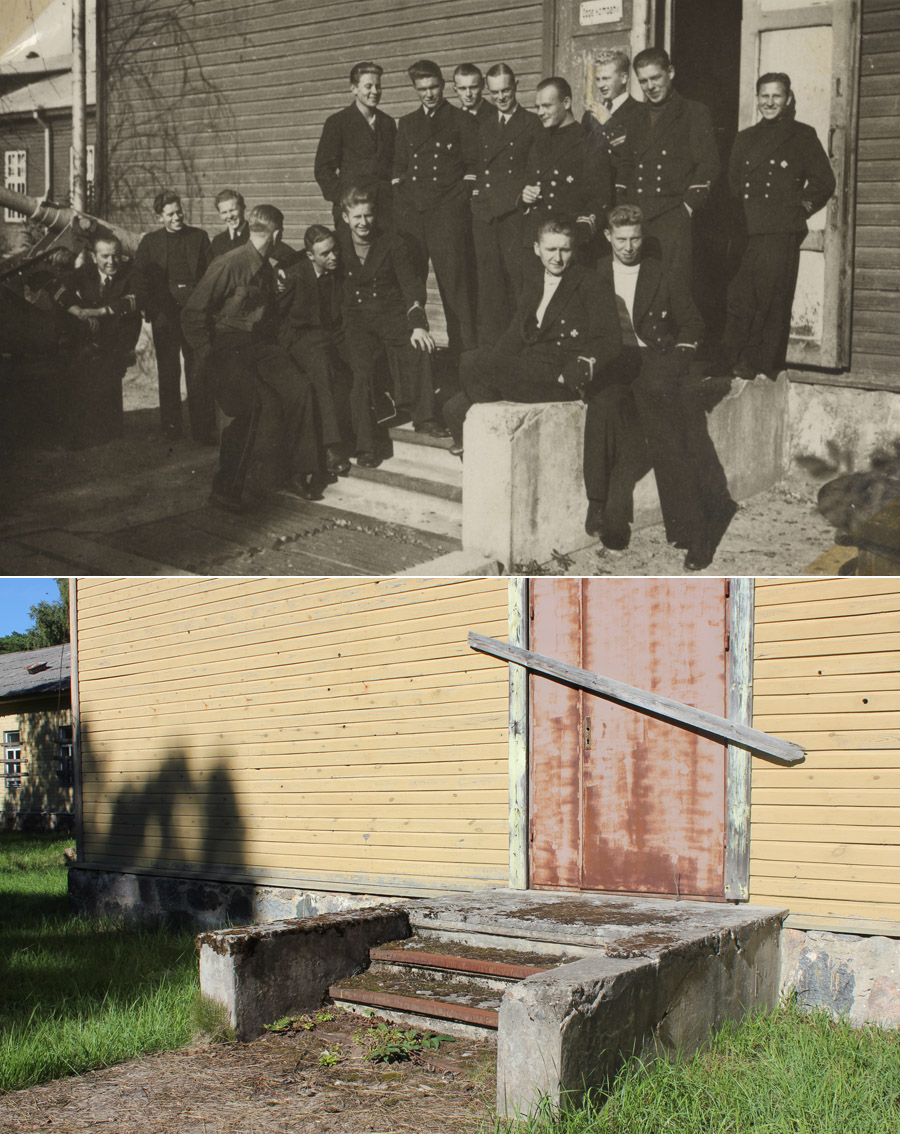 Mõned enne/nüüd pildid Aegna saarelt - esimene pilt helgijaamast Nr. 1 ja ülejäänud kaks ühiskasarmu lõunapoolsest uksest.