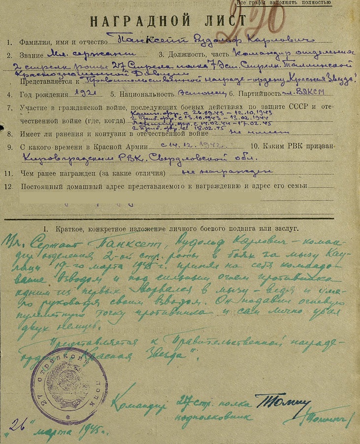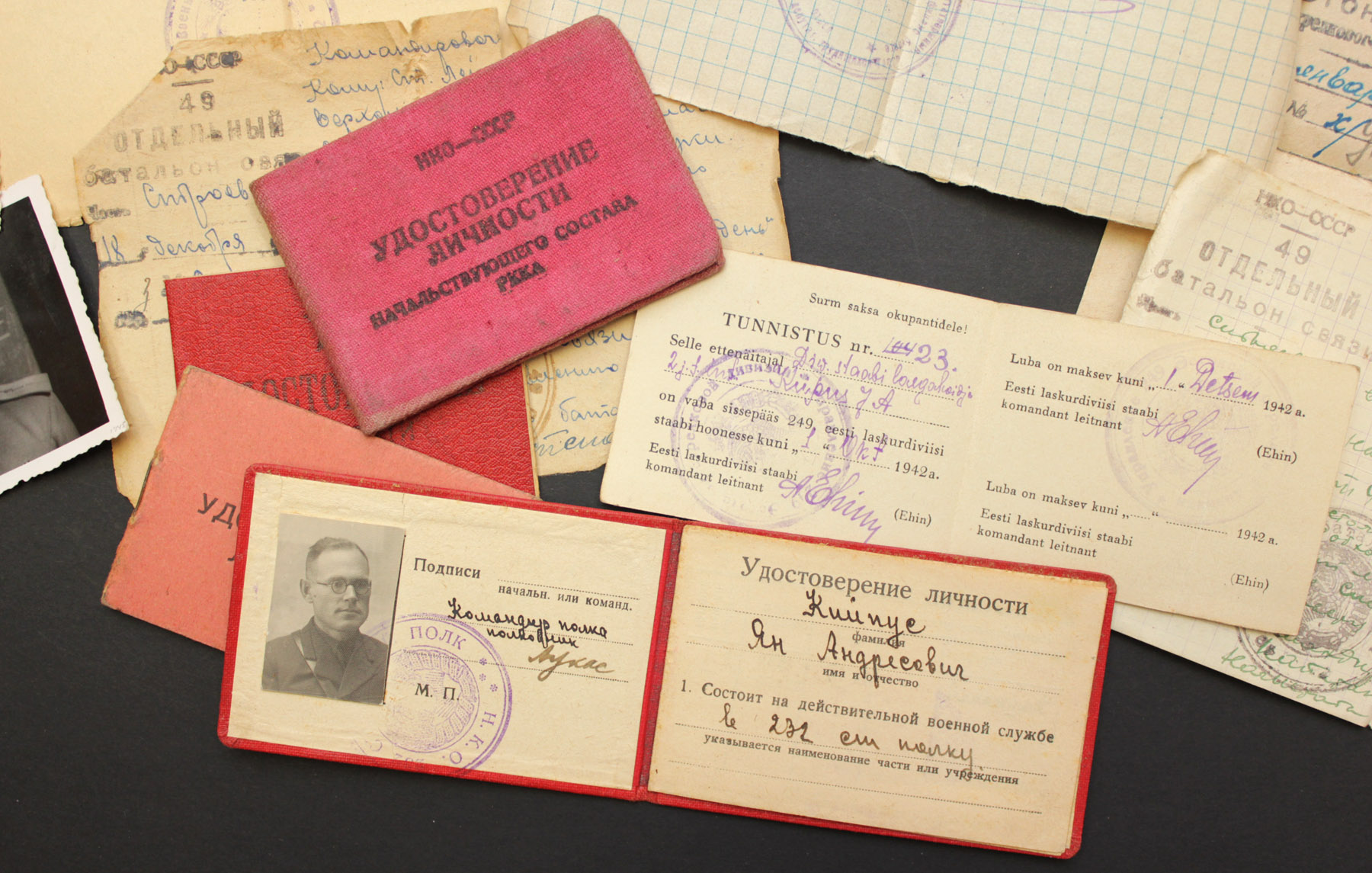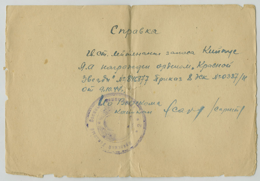 Paberite hulgas on ka sõjaaegne (esmane) Punatähe ordeni tunnistus. Temale antud ordeni number oli 846877 ja sama teema 12. leheküljel olen paar aastat tagasi näidanud leitnant Edgar Nittimi Punatähe ordenit, mis oli numbriga 846878. Kiipuse orden oli juba varem rändama läinud - ehk õnnestub see kunagi dokumendiga jälle kokku viia.
