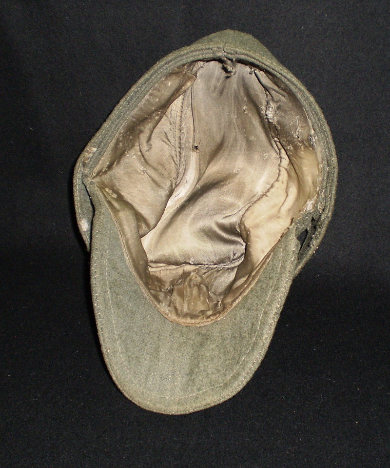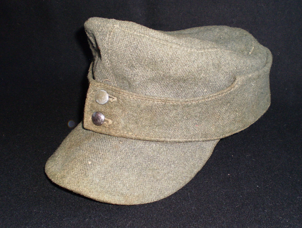 WH M43 välimüts millel trapets eest ära lõigatud. Õrn jälg näha. Pole näinud ega kuulnud, et siinmail trapetsiga SS-i oleks liikunud. Kuigi välistatud ei ole. Ees on tsenterõmbluses ja voodris auk sees ja on kantud klemmidega mütsimärki (EW KV mütsimärk, mõni EW kokard, kohaliku tööna valmistatud SS kolp..?)