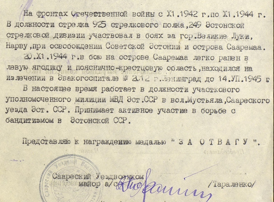 Ilus komplekt! Vaata, näiteks väga lähedaste numbritega autasud on leheküljel 9. Kapten Tsuhnenkov, 7. Eesti Laskurdiviisi 354. Laskurpolgu miinipildujate roodu komandör.