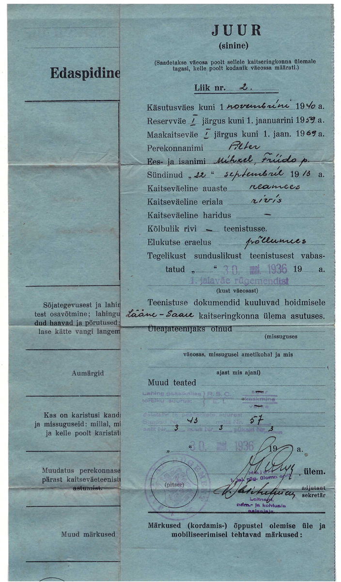 Veel üks Rannapatareis Nr. 1 teeninud reamehe KV teenistuse tunnistus.