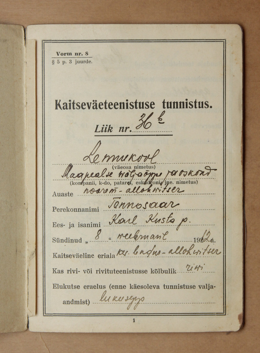 Lillade kaantega Auto-tanki rügemendis teeninud noorem autojuhi Kaitseväeteenistuse tunnistus ...