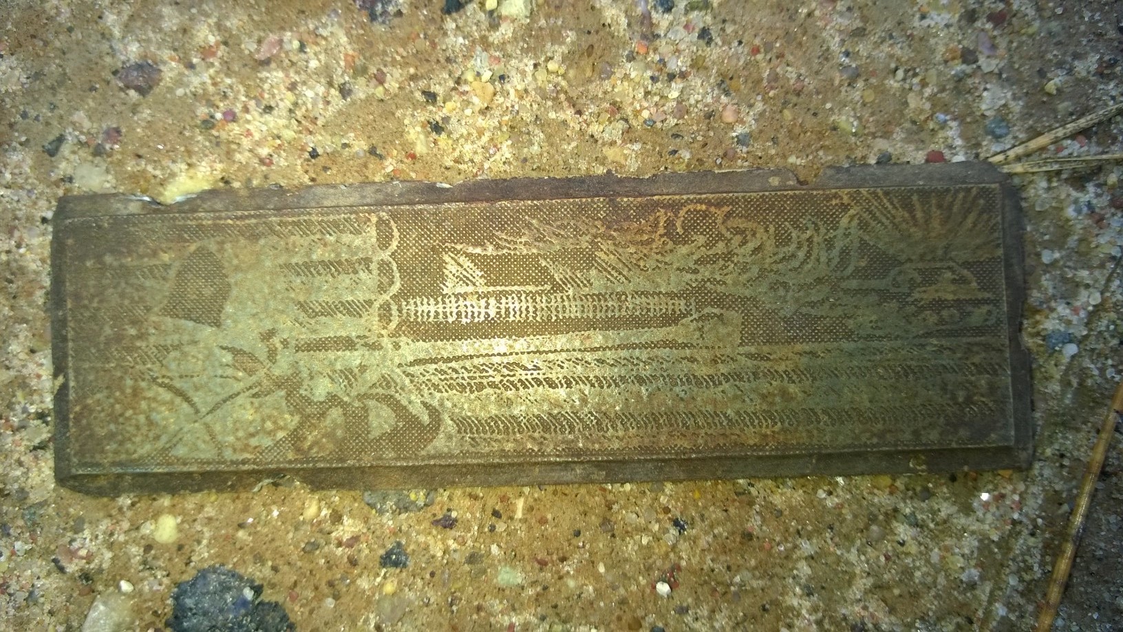 trükiplaat ta ei ole.tundub graveeritud.vasakul pool,kui hästi tähelepanelikult vaadata on sõdur tankirusikaga-sellest ka lõhkemine tanki kohal.materjal on imelik-ei alu ega vask,ka mitte raud.neli kida oli küljes nagu kinnituseks-need murdusid ära,kui välja võtsin.