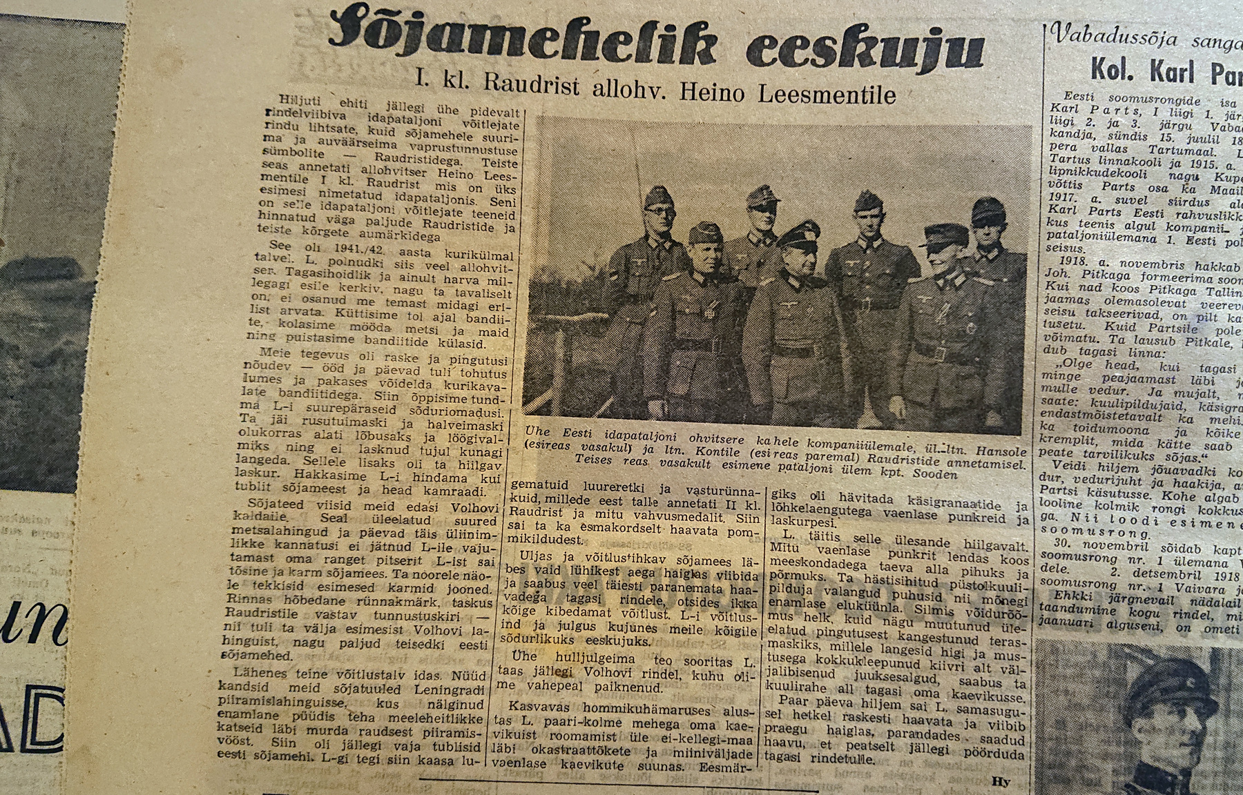 524. allohvitser Heino Leesment - EK2, EK1 (Volhovi lahingud, "Põhja Kodu" 14.12.1943, Rindeleht)