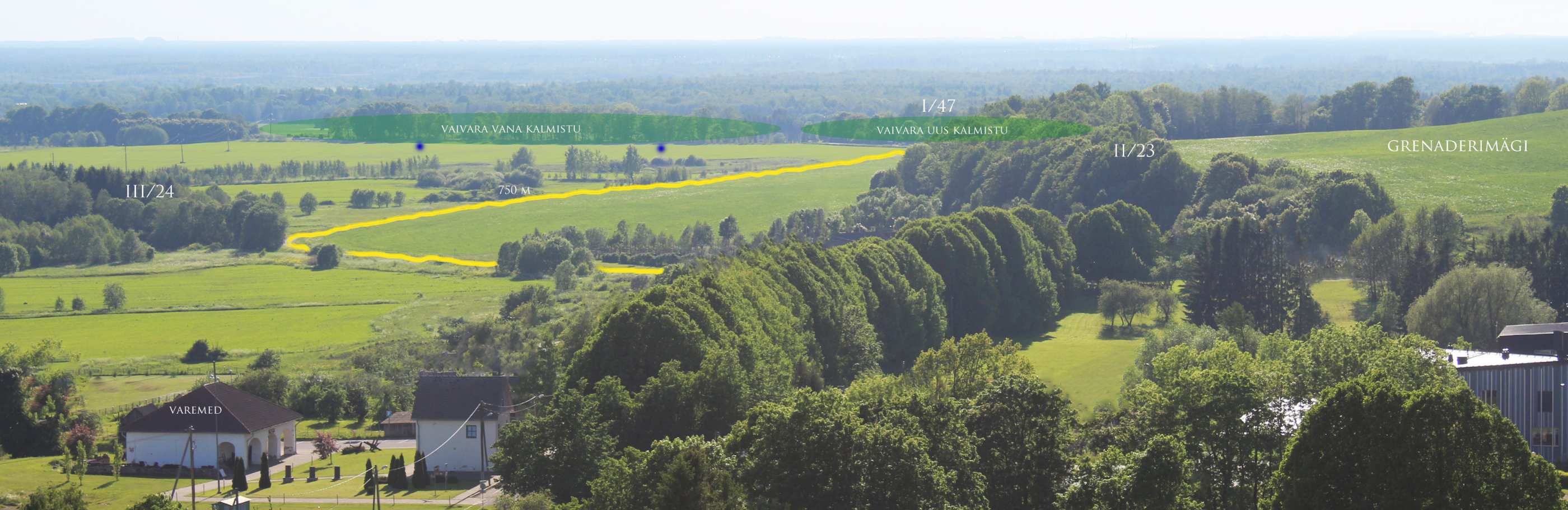 Kollane triip markeerib maanteed, kalmistu eest kuni kurvini on ca. 750 meetrit, sinised täpid Vaivara vana kalmistu ees on PAK'i positsioonid.