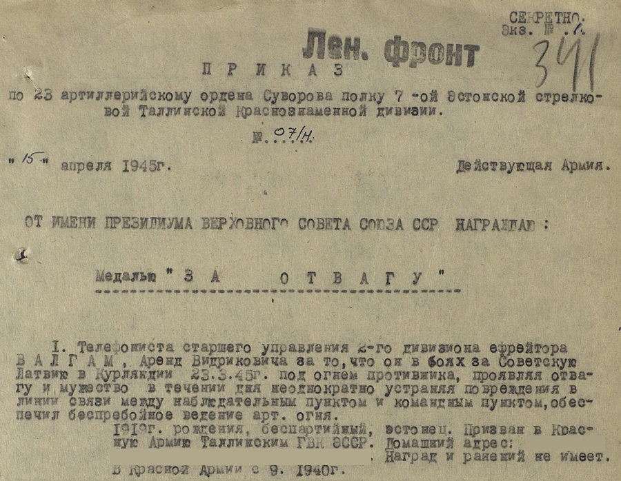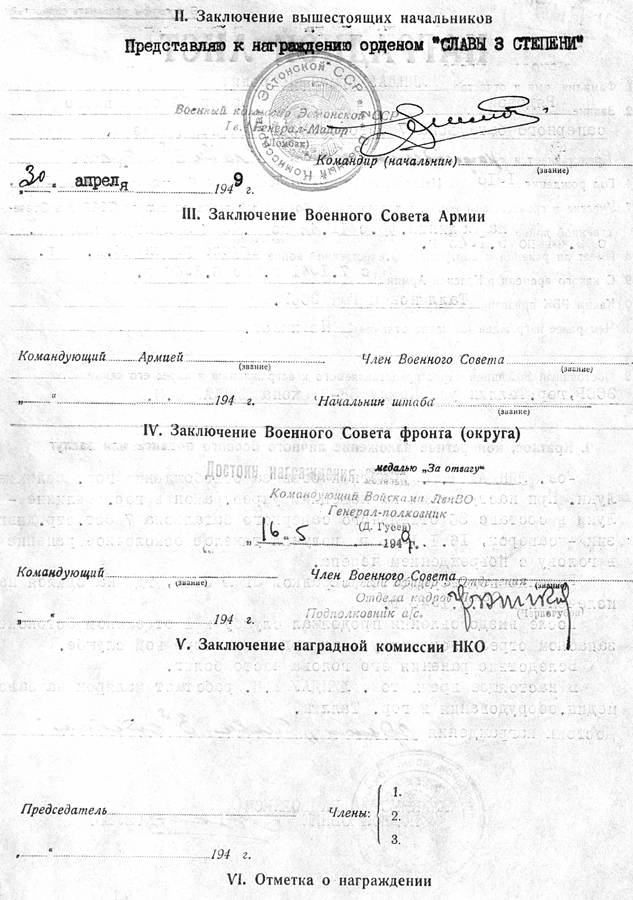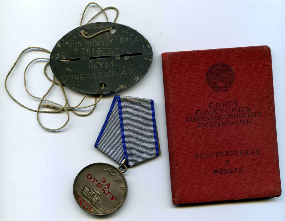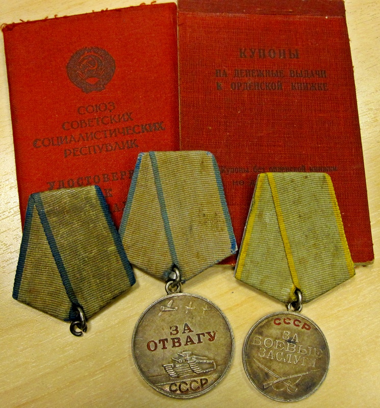 Mõned päevad tagasi Raplast leitud "Za Otvagu" (186402) ja Gvardija - tunnistusi kahjuks ei ole aga usun, et märgid kuulunud Eesti Laskurkorpuse mehele. Medali numbri järgi võiks oletada, et autasu annetatud Velikije Luki lahingute eest, lint on sõjamehe enda poolt valmistatud aga usun, et tehtud juba sõjaajal.