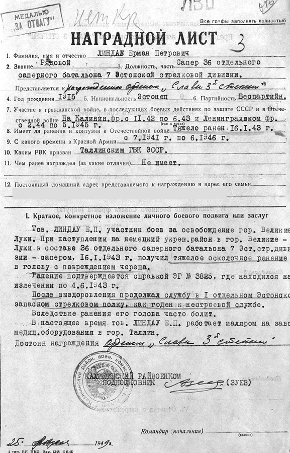 -Esimeselt varasemalt autasulehelt on näha, et Lindau oli tõesti osaline Velikije Luki lahingutes 7.Laskurdiviisi sapööripataljoni koosseisus.